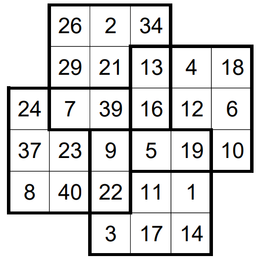 April’s challenge had solvers searching for a novel arrangement of almost magic squares with no repeated numbers. The lower the total sum of entries the better, and the best number achieved was 470. Above is an example of one of these optimal grids.