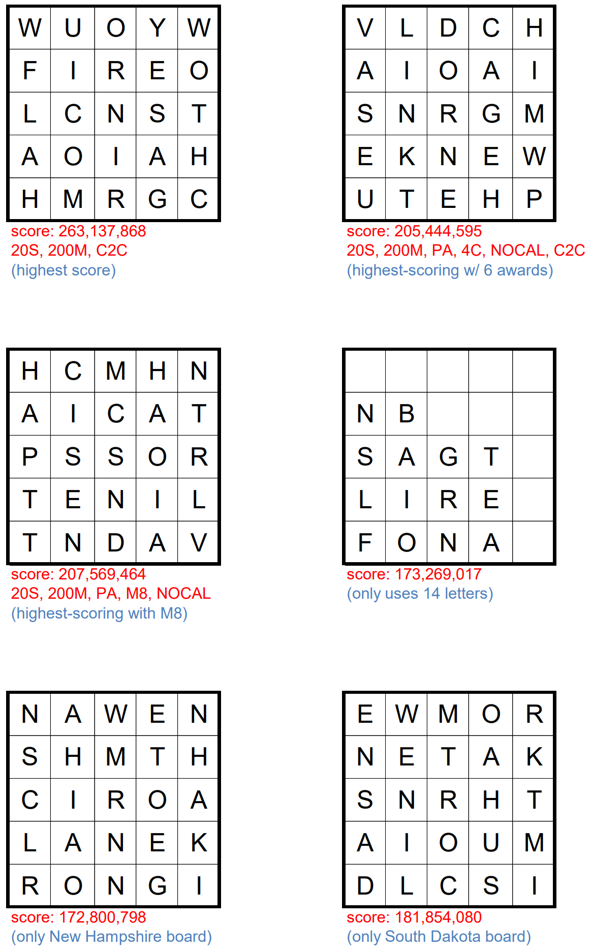 - Connecticut and Rhode Island were the only states to appear in exactly zero boards. (Does there exist a valid board that contains both of these, and which excludes Texas?)