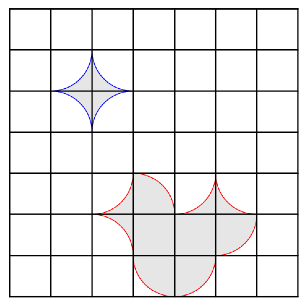 In the 7-by-7 grid above, one can draw a simple1 closed curve using nothing but quarter-circle segments. Two examples are shown above: one enclosing a region of 4-π (in blue), and one enclosing a region of area 6 (in red).