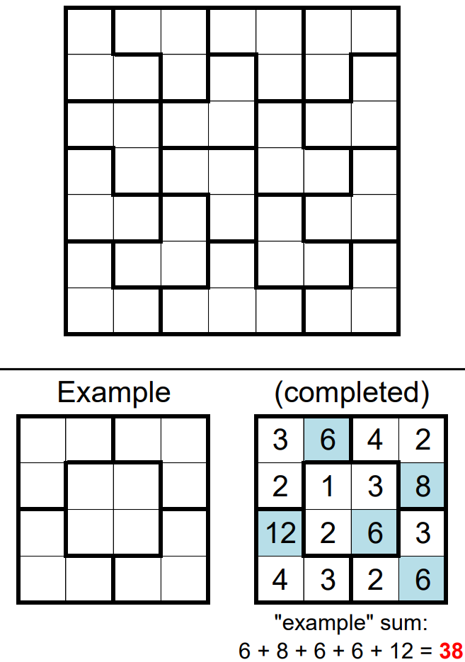 Fill each cell with a positive integer such that integers do not repeat within any row, column, or outlined region. Within each region, one cell must be equal to the product of the other cells, and these “product” cells may not share edges with “product” cells from other regions. (See the example.)