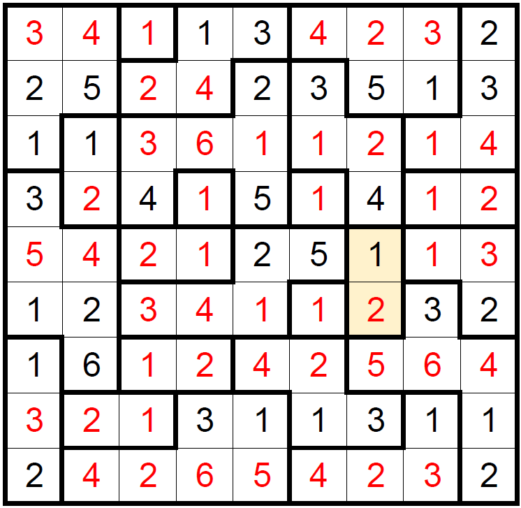 There are two ways to complete this month’s puzzle, one of which is shown here. (The other comes from switching the 1 and 2 in the shaded region.) In either case, the sum of the largest concatenated values (the values in red) in each region is 6647, which is the answer to this month’s puzzle.