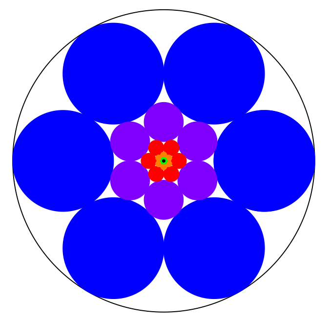 For the next ring, the largest radius one can achieve is if we rotate the ring by 30 degrees, in which case we get a maximum radius1 of (2 + 4 Sqrt[3] − 4 Sqrt[1 + Sqrt[3]])/18.