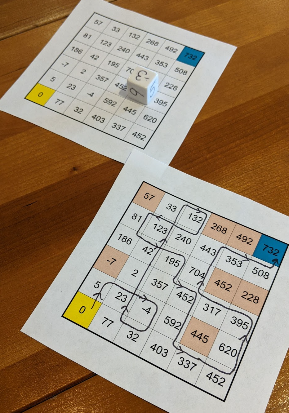 (Of interest, note in the upper grid the placement of the die after the 26th move. Several entries claimed that a path existed through the 452 immediately north of the 317. But to move to that cell would cause the score to increase by 27×9, which is not a legal move. The only legal move is to the eastern 452, as 452 = 317 + 27×5.)