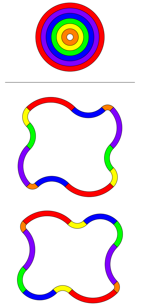 The annuli are then cut into quarters, and these 24 quarter-annuli are rearranged to form the two loops shown below.