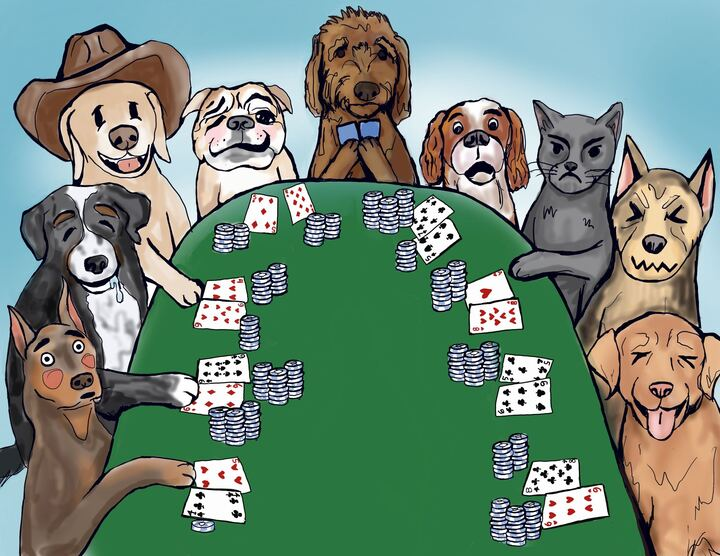 Some of the animal faces might look familiar… in fact every face is a version of a standard emoji. Being hinted that we want to spell out what their feeling suggests that the names of these emojis could be indexed into, perhaps by the card holdings, which are all numbers 1-10 (interpreting aces as 1). The emojis represented have fairly standardized names, and the successful ordering is reading the letters for each card from the viewer’s left to right. For example, the leftmost pooch, clearly quite FLUSHED, has a 4 of clubs and a 5 of hearts, which correspond to the fourth and fifth letters of FLUSHED, ‘S’ and ‘H’. Reading these 16 letters off left to right and adding spaces where appropriate gives SHIFT BY CHIP COUNT.