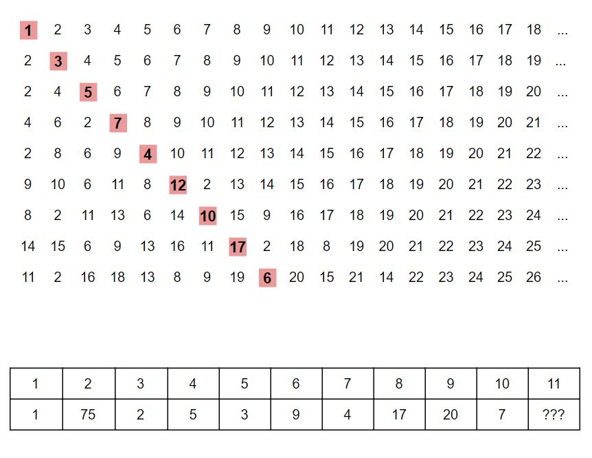The bottom grid displays, for each number 1 through 10, the number of the row where it is eventually expelled. It is not until row 416 that the number 11 is finally expelled! Most solvers wrote a quick program to compute this instead of running through it manually. A program would have been essential if we had asked for the row where the number 48 is expelled!
