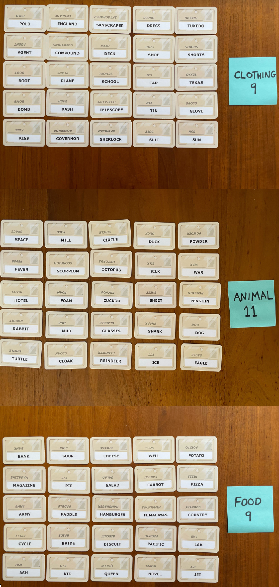 The three best first plays from our recurring Codenames game night are pictured above: one matched eleven words and the other two matched nine each! We looked at the boards over and over again and decided that when the clues encode the target words in such a binary fashion you can get impressive results.