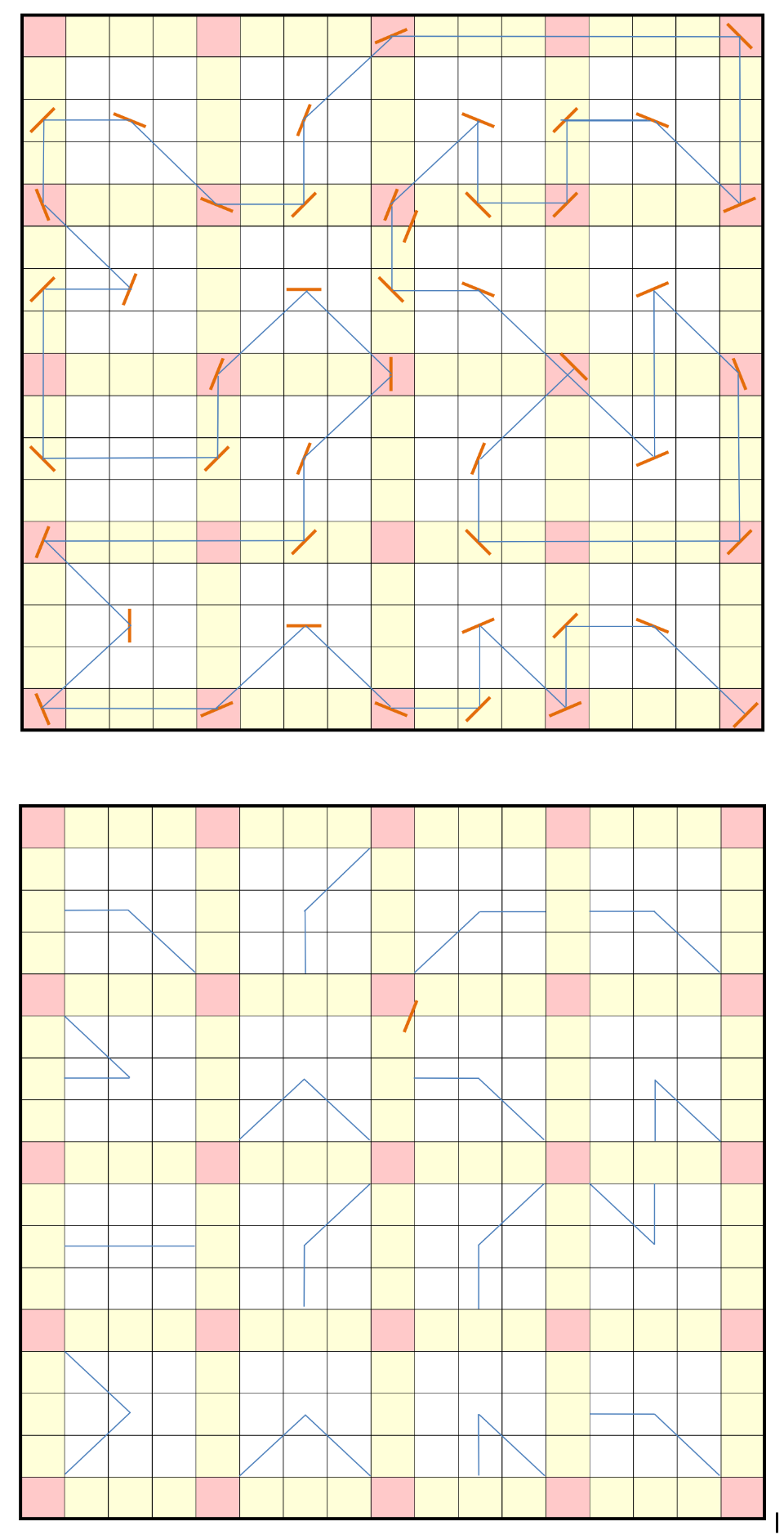 And so for this grid: the path of light passes through each of the sixteen white 3-by-3 regions, through their centers, and at angles that are multiples of π/8. This corresponds to flag semaphore lettering. (Weakly alluded to by the yellow and red coloring of the boundary cells.) When translated, and noting the extra orange segment (above) is an apostrophe, not a mirror, we get the answer to this month’s puzzle, SEASON’S GREETINGS.
