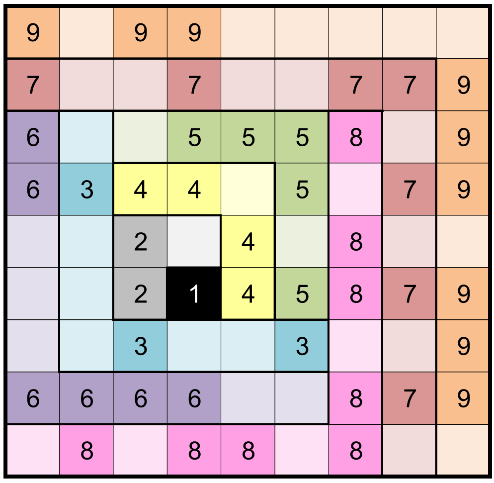 The above image shows the completed grid; the product of the areas of the empty regions is 8400.