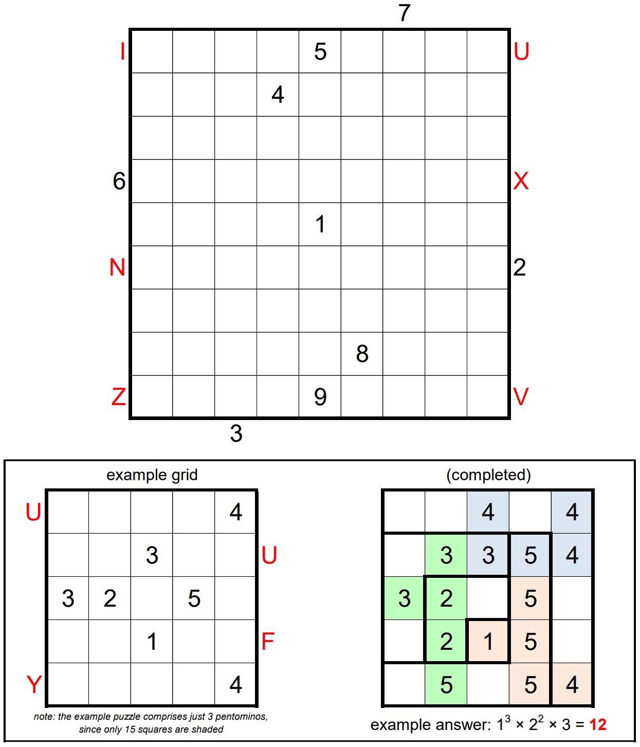 A value outside the grid denotes the either first number or pentomino1 (from the decomposition) seen when looking into that row or column.