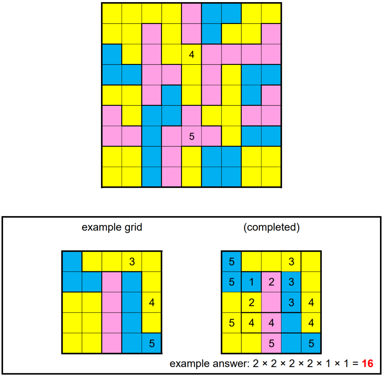 The answer to this puzzle is the product of the areas of the connected groups of empty squares in the completed grid.