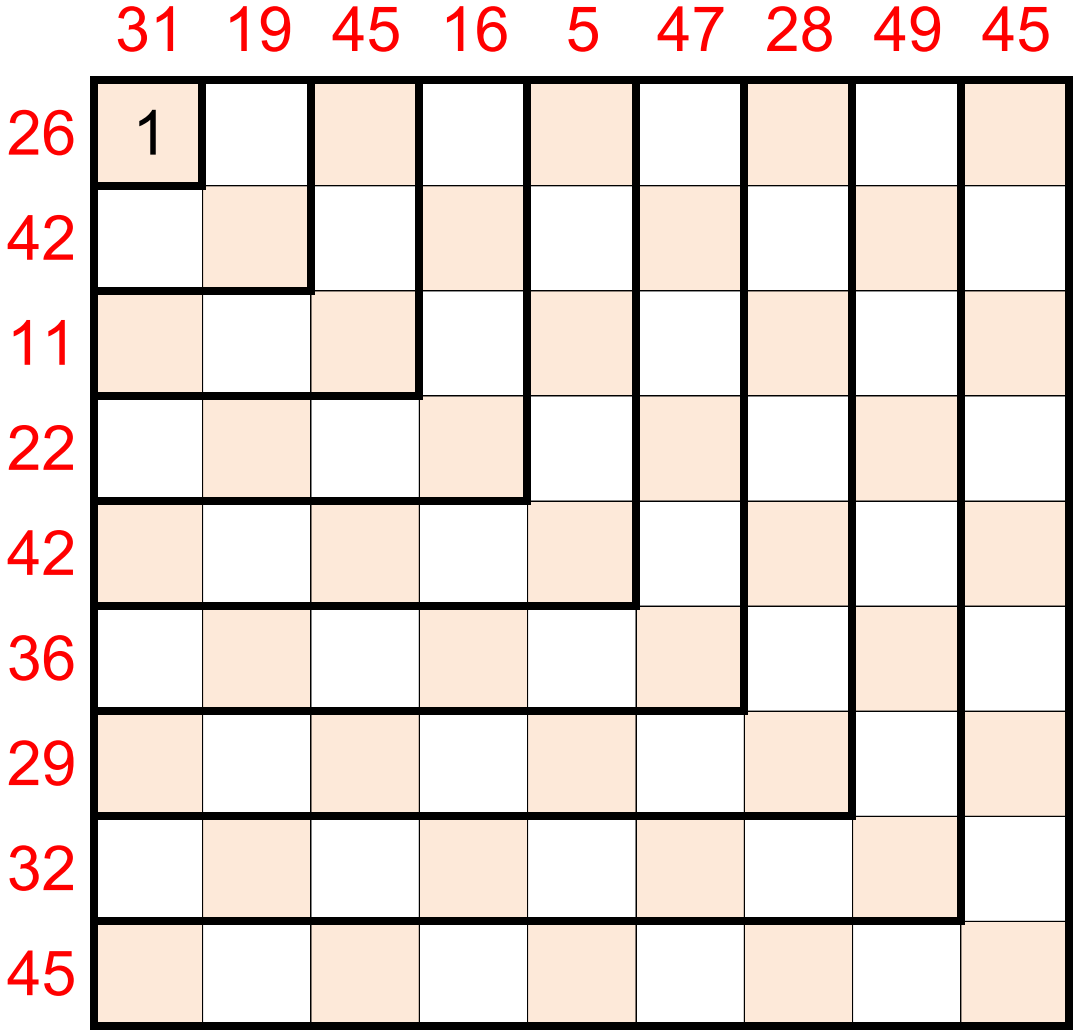 In the grid below, enter nine 9’s in the outermost hook, eight 8’s in the next hook, then seven 7’s, six 6’s, and so on, down to the one 1 (already entered), so that the row and column sums match the values given along the border.