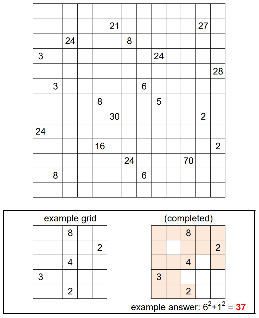 The answer to this puzzle is the sum of the squares of the areas of connected unshaded squares in the completed grid. (Squares are “connected” if they are orthogonally adjacent.)