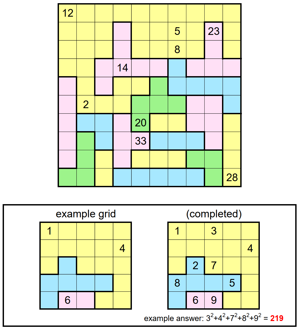 The answer to this puzzle is the sum of the squares of the largest label in each row of the completed grid, as in the example.