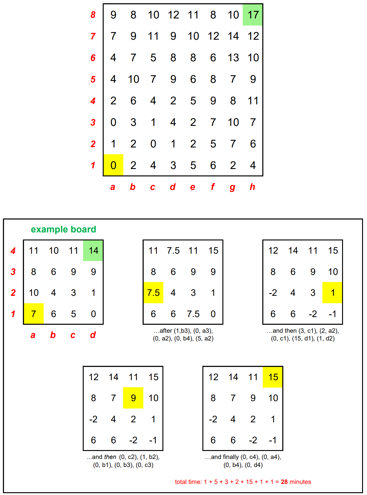 But there’s a big problem here, which is that this grid was built on a swamp, and the lattice points are prone to sinking. Whenever the knight arrives on a lattice point of altitude A, that point and all others with the same altitude start sinking at the rate of 1 unit per n minutes, where n is the number of lattice points of altitude A. Furthermore, the lattice point diametrically opposite the one the knight is on rises at the rate of 1 unit per n minutes. This sinking (and rising) continues only while the knight remains stationary, which may be for as much or as little time as the knight chooses. No other points move or begin to move during this time. (Altitudes can become negative. In the event that the “opposite” point is at the same initial altitude, it neither rises nor sinks, and is ignored for the purpose of calculating n.)