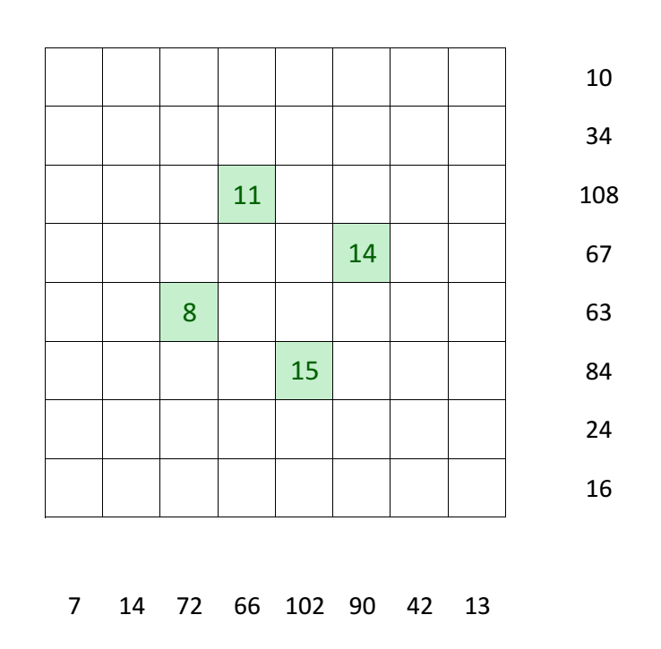 The numbers along the sides of the 8 rows and 8 columns are the sums of the numbers of the squares visited by the knight in that row/column.