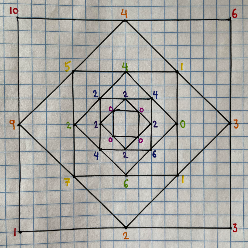 Assign four nonnegative integers to the corners of a square, which we designate the active square. During a step, for each side of the active square, the absolute difference between the numbers on that side’s endpoints is assigned to its midpoint. Then these four new midpoints are connected into a new square (tilted 45 degrees from the previous). This new smaller square becomes the active square. Continue these steps until the active square has all zeroes on its corners.