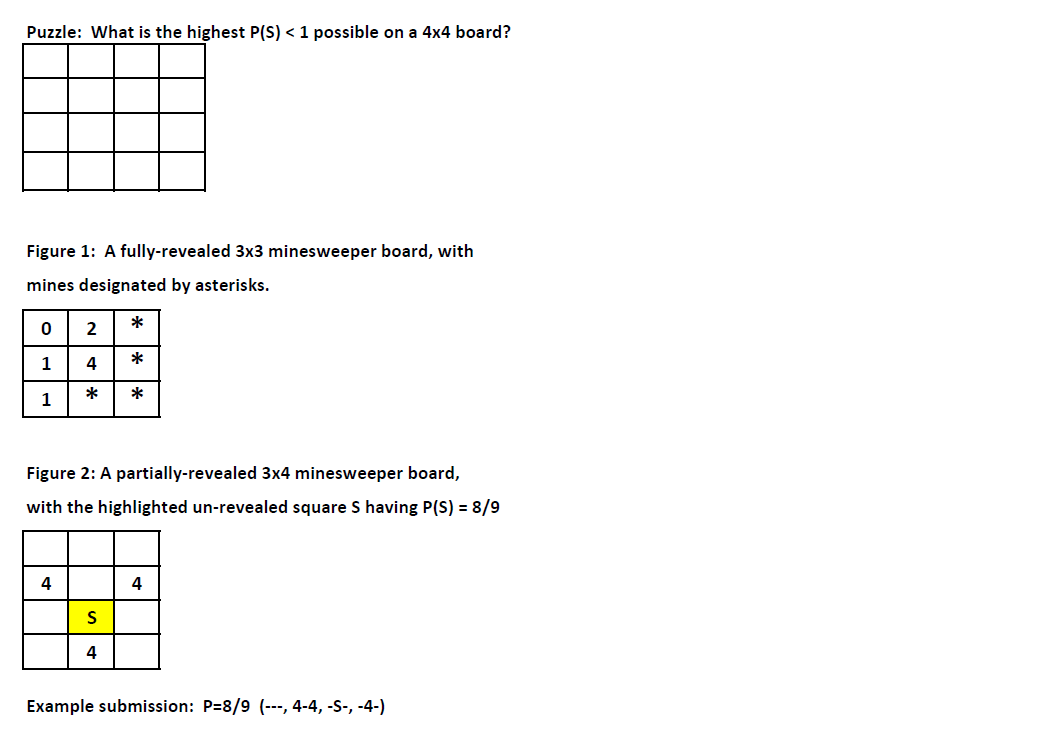 This month’s puzzle: Consider a partially-revealed minesweeper board. For a given unrevealed square S, let P(S) be the probability that S contains a mine, assuming that all possible solutions for the partially-revealed board are equally likely. Design your own partially-revealed 4x4 minesweeper board, trying to maximize the value of P(S) for the square of your choice, while keeping P(S) less than 1.