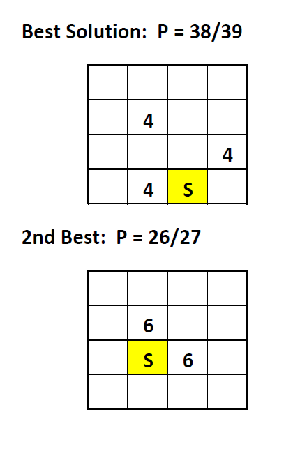 We received a number of different solutions, but the 2 best arrangements we received are presented here. Congratulations to the 10 solvers who submitted the best solution with P = 38/39, and especially to Thomas Hansen, this month’s randomly-selected winner of a Jane Street t-shirt!