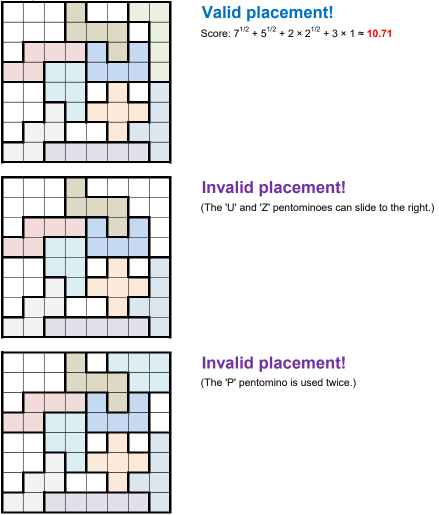 This month, when you send in your entry, please send in your grid. Please use the standard notation, — i.e. F, I, L, N, P, T, U, V, W, X, Y, Z — and use “.” to denote empty spaces. (So the top row in the valid placement example would be “…Z..LL”)