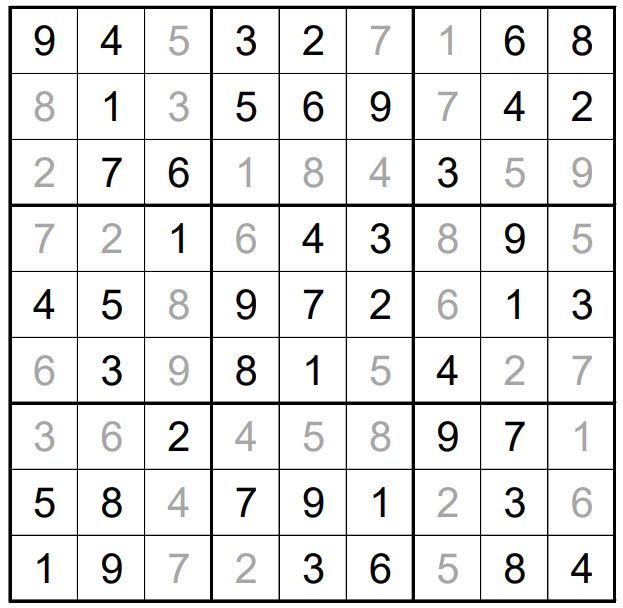 The completed grid is shown above, and the sum of the squares of the numbers written over the grey clue values is 1146.