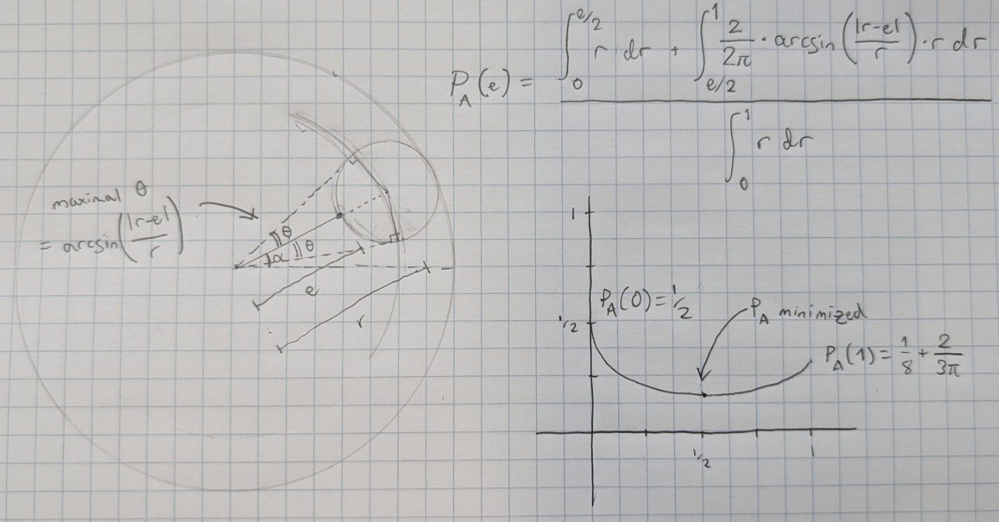 Maximizing the fraction of the circle of radius a inside the radius-|r−e| circle is equivalent to maximizing the subtended angle determined by the circles’ intersection points. This gives rise to the arcsin integral above. (The r multiplier inside both integrals and 2 multiplier generated by the bottom integral is to account for polar coordinates — e.g. if the flag has an ε probability of being placed in a tiny annulus of radius ≈δ, it has a 2ε probability of being placed in a tiny annulus of radius ≈2δ.)