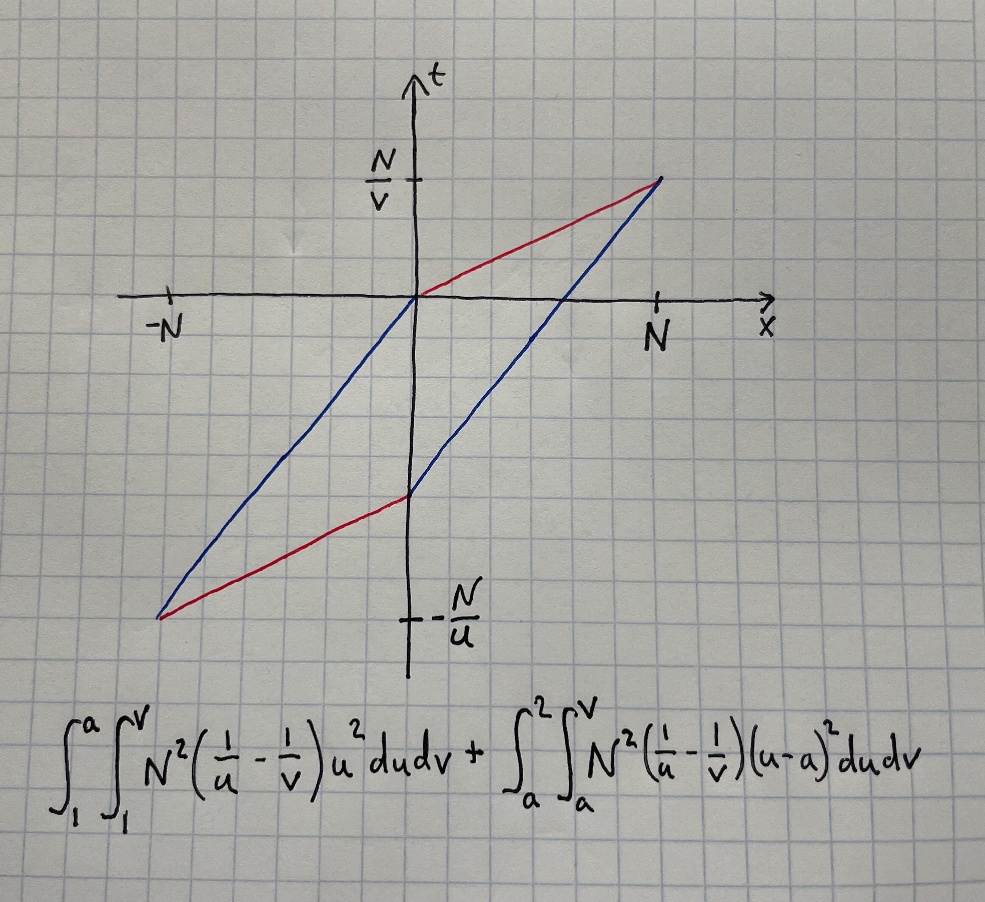 So say the two speeds we select are u < v, and without loss of generality we fix the position of the car traveling v to enter the highway at (0, 0) (the first coordinate is in distance and the second is in time). Then the car will exit the highway at (N, N/v), and the starting positions of the u-speed car that need to be overtaken by the v-speed car are those within the pictured parallelogram (again we are ignoring weirdness along the boundary because it will go to zero in the limit). A few different methods can compute the area of this parallelogram to be N2(1/u - 1/v). There are other ways to reason out this base rate but I like drawing parallelograms.