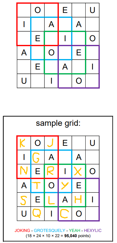 Words are formed by making king’s move between squares. Squares may be revisited within a word. (As is done in the example, with the ‘E’ in ‘GROTESQUELY’.) Note that staying put (i.e. not moving) is not a legal “king’s move”.