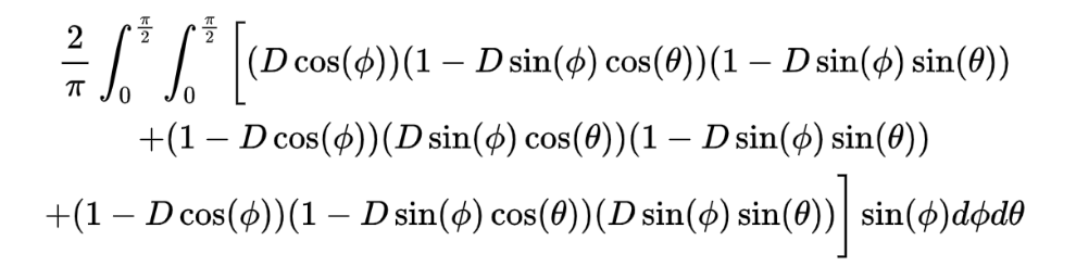 August’s puzzle was a three dimensional throwback to Single Cross from three years ago. Careful computation determined that for lengths D <= 1, the probability of a single cross comes to the pleasantly symmetric spherical coordinate double integral. (As seen above.)