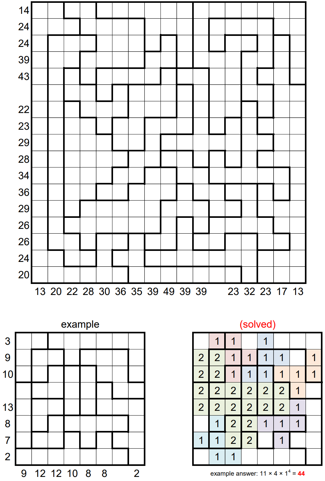 Once completed, you can submit as your answer the product of the areas of the connected groups of orthogonally adjacent empty squares in the grid.