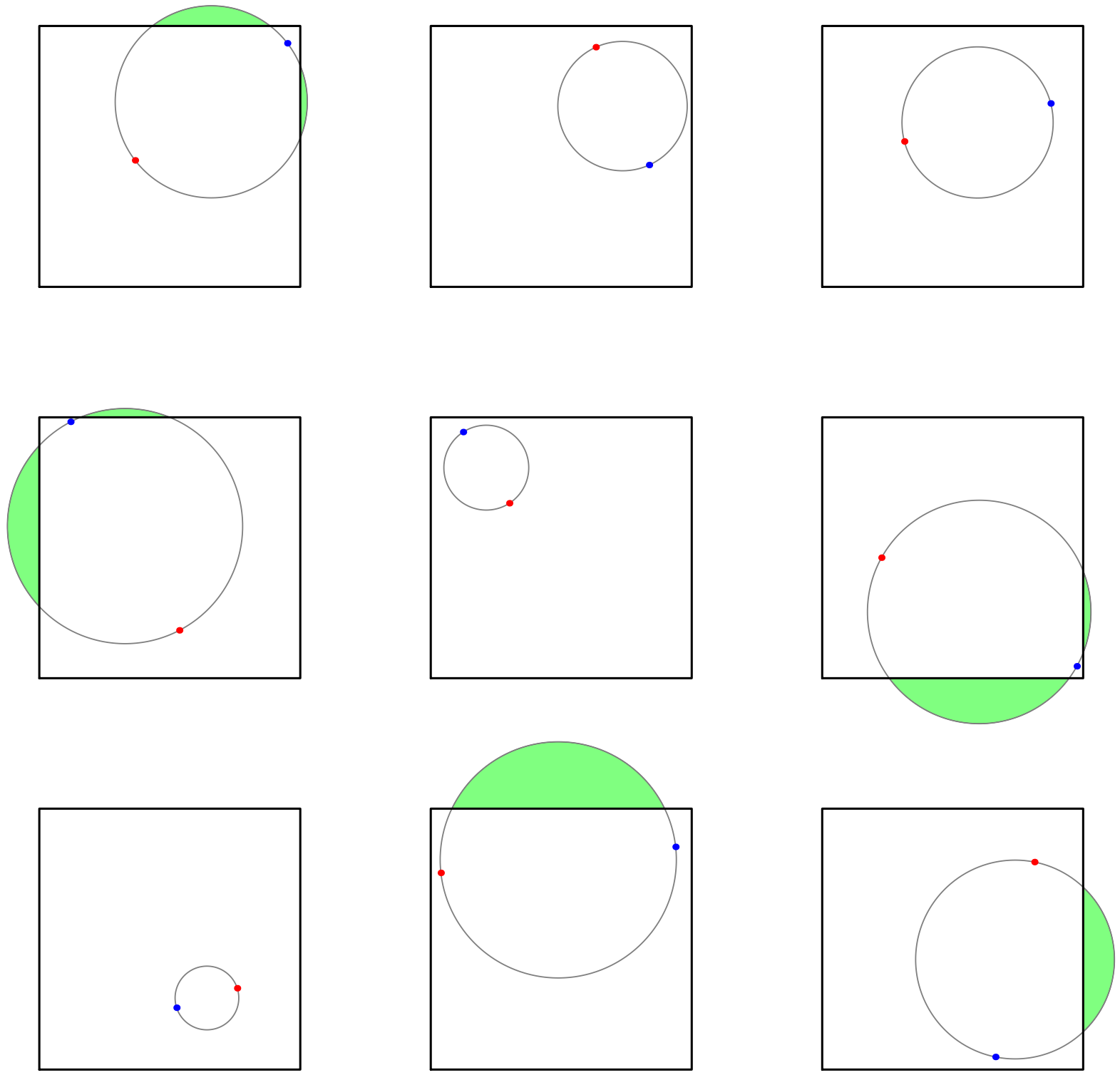 A circle is randomly generated by sampling two points uniformly and independently from the interior of a square and using these points to determine its diameter. What is the probability that the circle has a part of it that is off the square? Give your answer in exact terms.