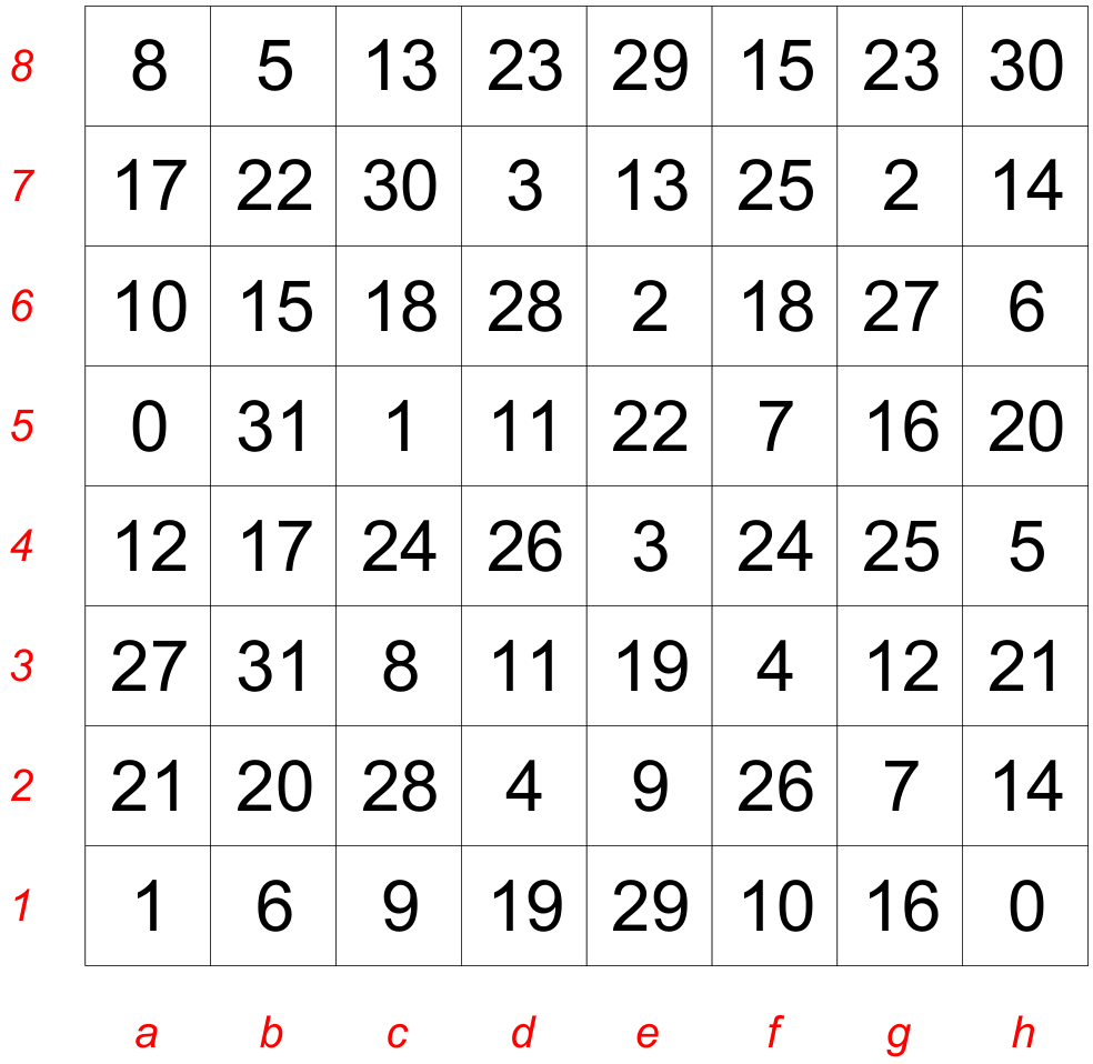 Example: a5, a3, b3, d1, a1, d4, h8, a1, h8 would have a sum of 0 + 26 + 29 + 12 – 7 + 17 + 20 – 10 + 18 = 105.