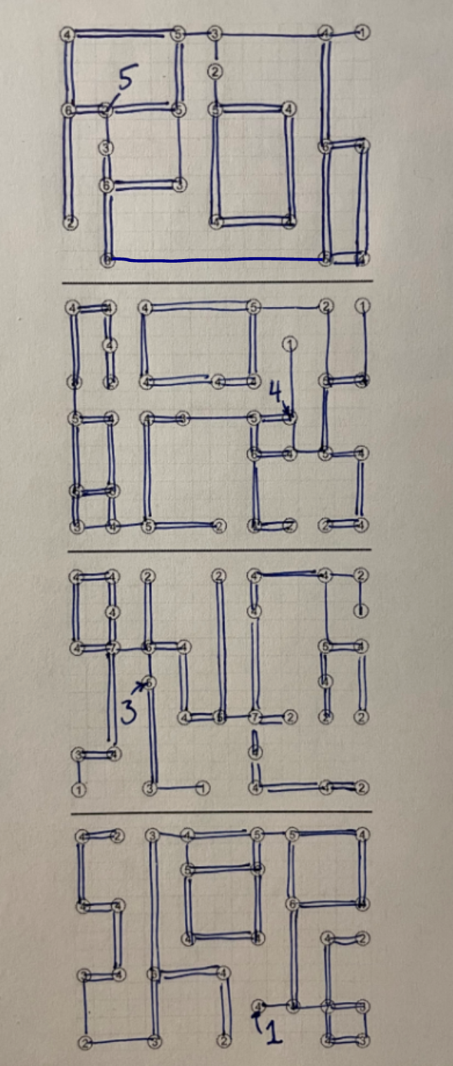 Your travels through Puzzle Forest continue with an encounter with a strange sort of bridge troll… some vague directions and a puzzle layout suggested you solve a Hashi (a.k.a. Bridges) logic puzzle with a twist: each of the four puzzles had exactly one inaccurate number.
