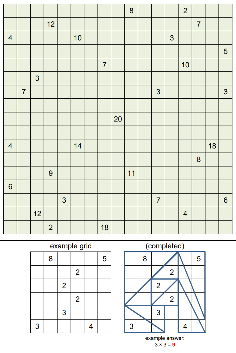 Each triangle must contain exactly one number. That number represents the area of the triangle containing it. (Every number must eventually be contained in exactly one triangle.) The entire square (1-by-1 cell) containing the number must be inside the triangle.