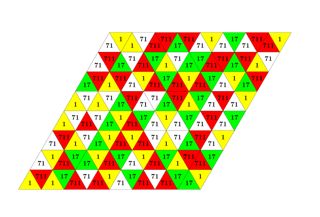 Label the sides of a tetrahedron with 1, 17, 71, and 711. On the board presented here, place the tetrahedron on one of the top 8 triangles, and roll it until it reaches one of the bottom 8 triangles, such that whenever the tetrahedron is touching the board (including its initial placement), the number on its base equals the number on the board. What is the lowest possible sum of numbers that your tetrahedron encounters?