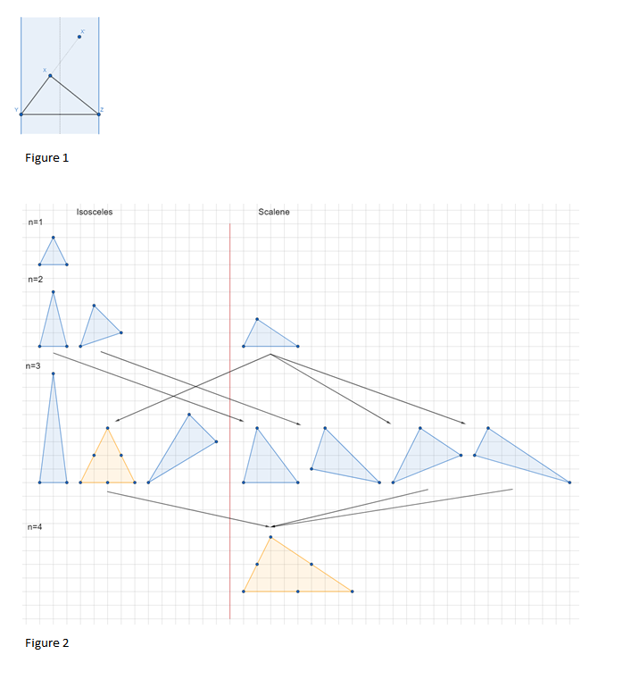 Note that if YX = XZ (the triangle is isosceles), then X’YZ is a right triangle and we should not count it. Figure 2 shows the set of valid triangles for n=1, 2, 3 along with an example triangle from n=4. An arrow from triangle A to triangle B means that triangle A generates triangle B