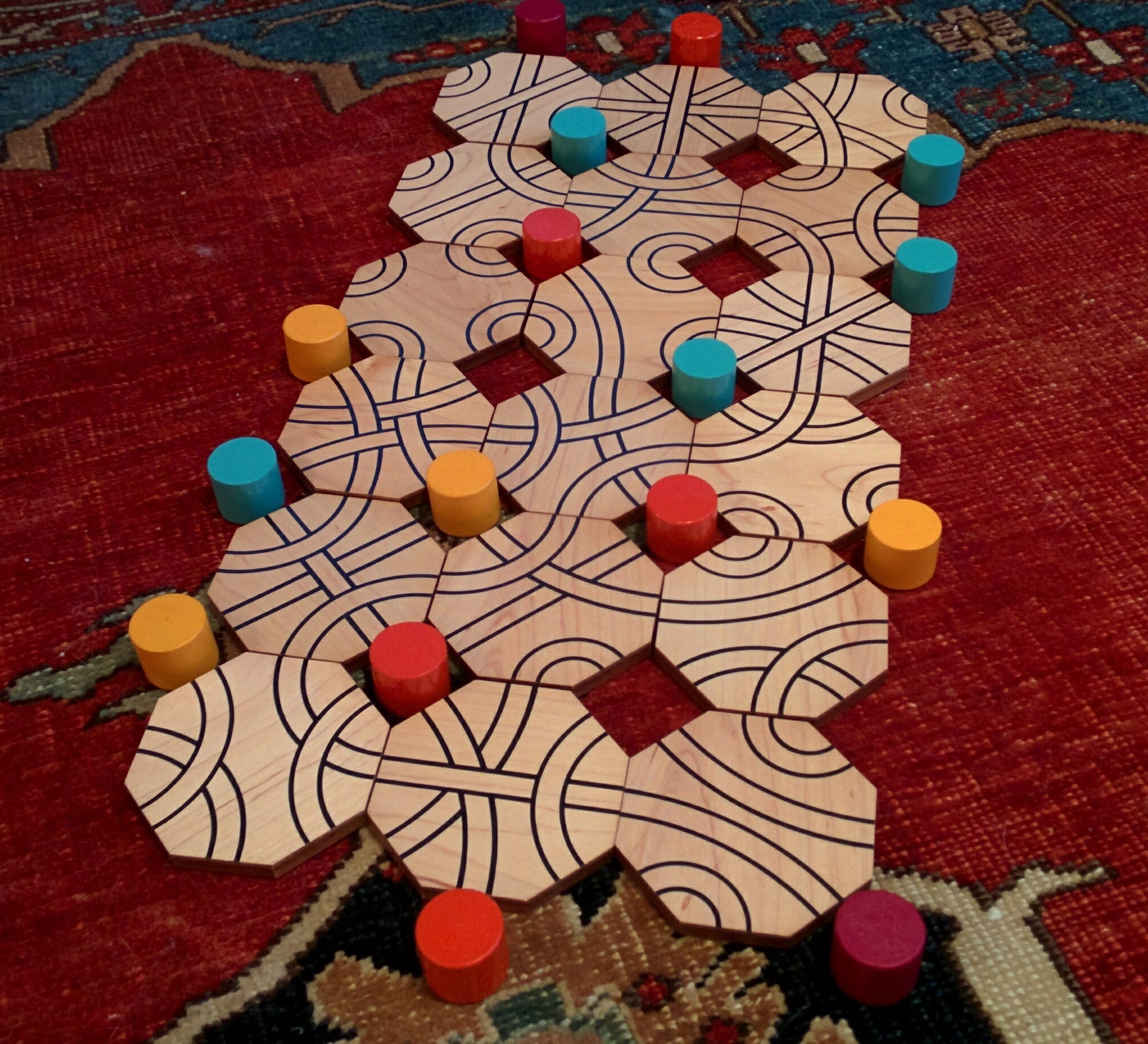 Only a few people were able to connect the dots to solve this month’s (super-hard) puzzle. And as it so happens, “connect the dots” is the first step in getting the solution. It is possible to rotate several of the octagonal tiles so that each group of similarly colored pegs is connected (as shown in the photo).