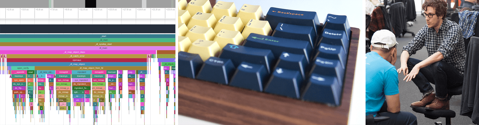 We're also happy to spend time and money on making it easier for the people here to get things done. This ranges from big projects, like the work we do on development tools (e.g. Iron, our in-house code review and release management system, and magic-trace, a tracing tool for in-depth performance analysis), to little touches, like getting people whatever crazy keyboard will help them get their work done most comfortably.